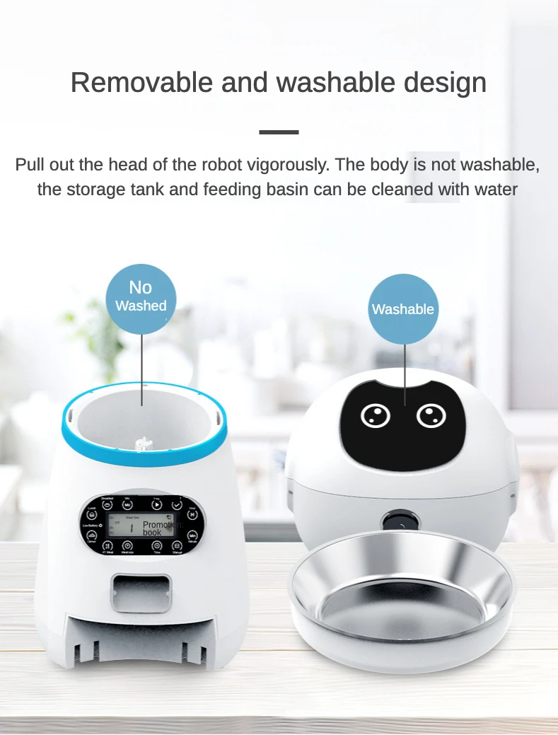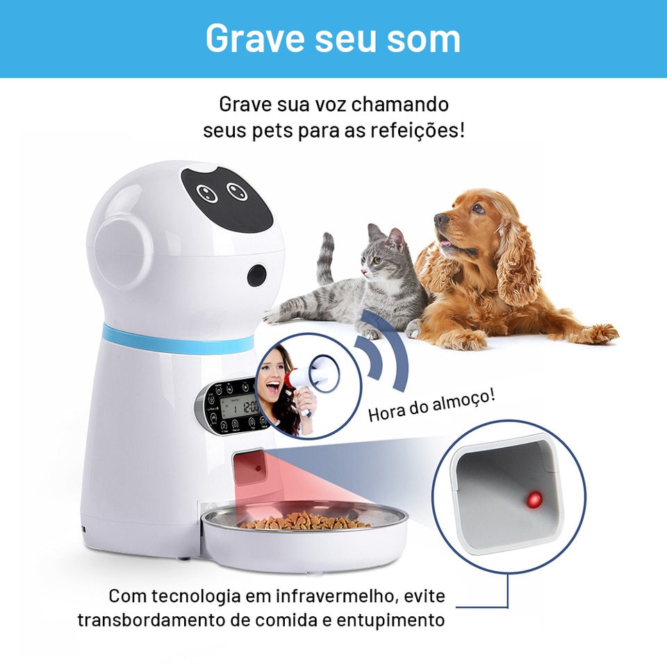 Este alimentador está equipado com um gravador de voz e alto-falante, que pode gravar sua voz por 12 segundos para chamar seu cachorro ou gatinho para comer. Sua voz pessoal evitará que seu animal de estimação fique sozinho ou perca a refeição quando a comida estiver pronta.