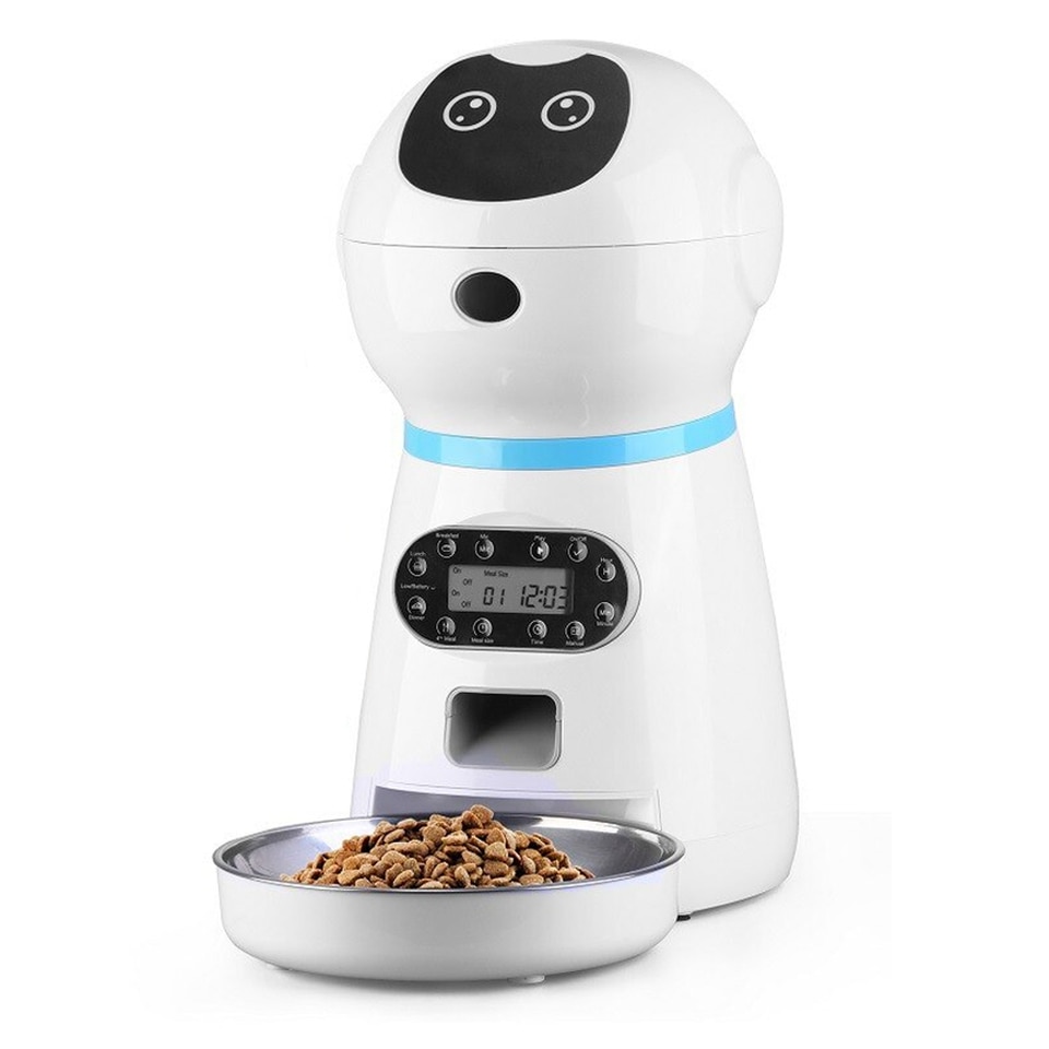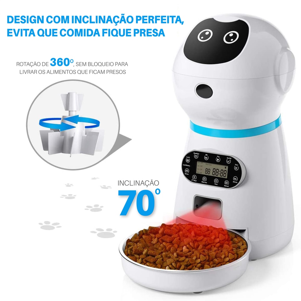 Este alimentador automático para animais de estimação oferece tamanhos flexíveis de refeições de 1 a 20 porções por refeição, 5 gramas por refeição e uma capacidade do recipiente de 3,5 litros.
